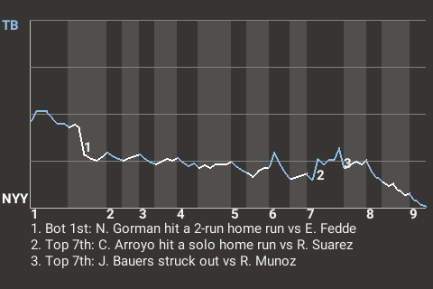 Nolan Gorman, who is tied for 6th in the AL in home runs with 10, took Tampa Bay hurler Erick Fedde deep in the bottom of the first. His 2-run home run put the Yankees on top, 2-0. In all, Gorman had 1 single in addition to the home run, while going 2 for 3.