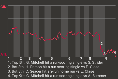 Getting a good performance from shortstop Corey Seager, the Atlanta Braves defeated the Cincinnati Reds, 5-4. Seager was 2-4 with 2 home runs. He drove in 3 runs and scored twice for the Braves. Picking up the save was Aaron Bummer, his 6th. Atlanta is now 11-24, Cincinnati 19-17.