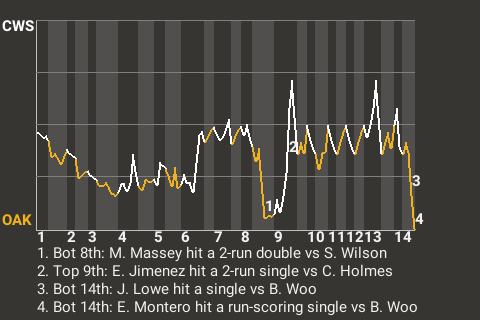 The clutch at-bat came in the bottom of the 14th inning, when Oakland first baseman Elehuris Montero, facing Bryan Woo, had a run-scoring single. It gave the Athletics the 7-6 win.