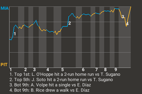 Miami used a clutch at-bat from Juan Soto to capture the win. The designated hitter hammered a 2-run home run in the top of the fifth inning to put the Marlins ahead, 4-1. It was his lone hit in 5 at-bats, but it was a humdinger.