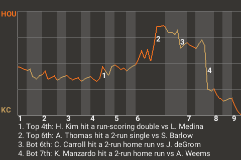 Kansas City took a 5-4 lead on Kyle Manzardo's 1st home run of the season. The 2-run home run, which Manzardo hit in the bottom of the seventh, left Houston pitcher Avery Weems visibly frustrated.