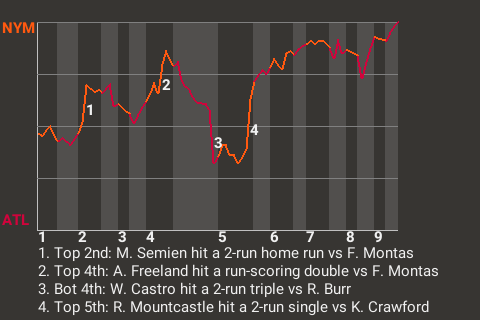Behind a fine performance from Marcus Semien, the New York Mets knocked off the Atlanta Braves, 8-6. Semien was 1 for 3 with a home run and 2 walks, while scoring 3 times and driving in 2 for the Mets. New York pitcher Ryan Burr earned the win, hiking his record to 3-0. Frankie Montas suffered the loss. The defeat makes Atlanta 31-43.