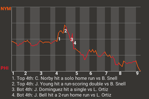 Philadelphia beat New York on the strength of starting pitcher Blake Snell's fine effort. The left-hander led his team to a win, 4-3. Justin Martinez recorded the save, his 20th. With the win, Philadelphia has a record of 49-27. New York falls to 43-33.