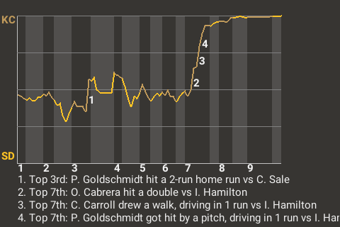 Paul Goldschmidt had a key at-bat with one out in the top of the seventh for Kansas City. With the bases loaded and the Royals leading 3-2, he got hit by a pitch, driving in 1 run.
