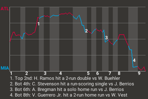 The Miami Marlins topped the Atlanta Braves, 6-4, with first baseman Vladimir Guerrero Jr. playing a big role. Guerrero Jr. was 2 for 4 with a home run, while scoring 2 and driving in 2 for the Marlins in the win. Sam Hentges notched his 1st save in 1 chances. Miami goes to 44-32, Atlanta to 31-46.