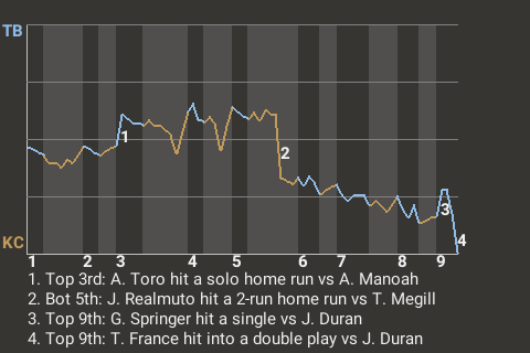 The Kansas City Royals got a stellar effort from pitcher Alek Manoah, helping Kansas City score a win over the visiting Tampa Bay Rays, 2-1. Manoah picked up the win for Kansas City, going 7.2 innings. He gave up 1 run on 3 hits. He now sports a record of 1-5. Jhoan Duran recorded the save, making him 21 for 24.