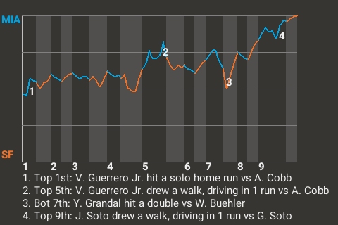Juan Soto, who leads the NL in bases on balls with 75, had a direct impact on the outcome. Soto contributed a run-scoring walk in the top of the ninth inning to put Miami up, 3-1.