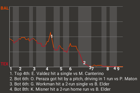 Baltimore had a runner on 1st in the top of the sixth. With no one out, Kerry Carpenter stood at the plate, hoping to find a gap. Instead, he flied out. The score remained 1-0, Texas. The Orioles never could mount a comeback.