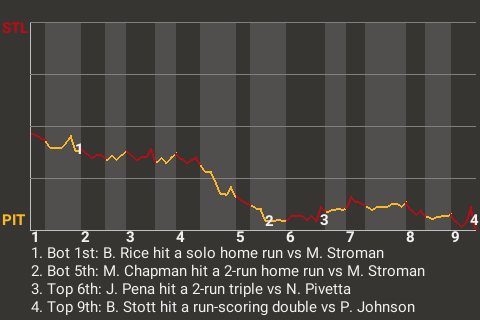 Matt Chapman had a big 2-run home run for the Pirates in the bottom of the fifth inning. With Pittsburgh leading 3-0 and a runner on 1st, he got a changeup from Marcus Stroman and swatted a home run to left-center. It was his 13th home run of the season, and more importantly, it put the Pirates ahead, 5-0.