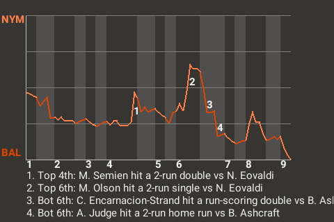 A good performance from center fielder Aaron Judge helped the Baltimore Orioles defeat the New York Mets, 6-5. Judge went 2 for 4 with 2 home runs, while adding 4 RBI and scoring twice for the Orioles. Baltimore starter Nathan Eovaldi was credited with the win after throwing 97 pitches over 7 innings. His record now stands at 5-2. Josh Sborz notched his 11th save in 18 chances.