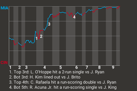 In the top of the 3rd, Miami took the lead on a 2-run single by Logan O'Hoppe. At the time, the Marlins were trailing 1-0, but O'Hoppe's hit with two outs against Cincinnati pitcher Joe Ryan put them in front, 2-1.