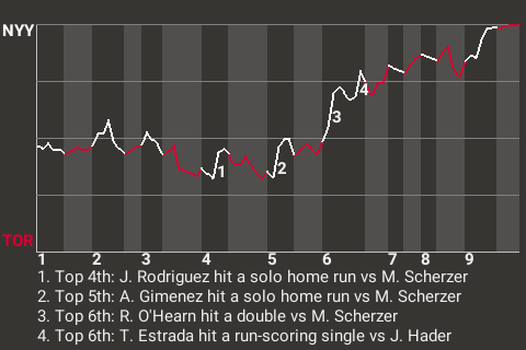 New York pinch hitter Thairo Estrada contributed a timely at-bat in the top of the sixth. With two down, he hit a fastball to center field for a run-scoring single. It was his 46th hit of the season and put the Yankees ahead, 4-2.