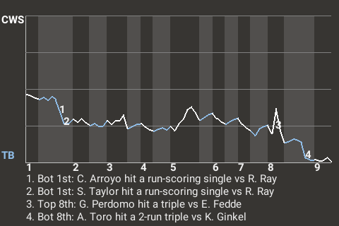 Tampa Bay took a 4-1 lead on Abraham Toro's 4th triple of the season. The 2-run triple, which Toro hit in the bottom of the eighth, left Chicago pitcher Kevin Ginkel visibly frustrated.
