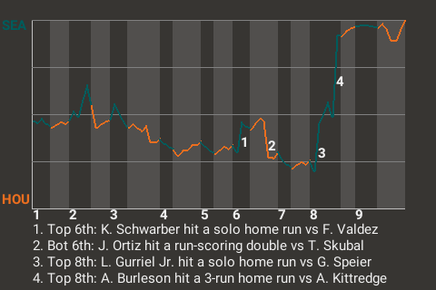 Burleson had a game-changing home run in the top of the eighth. On a 1-2 sinker from Andrew Kittredge, he banged a 3-run home run to left-center, giving the Mariners a 6-3 lead. It was the 16th home run of the year for Burleson.