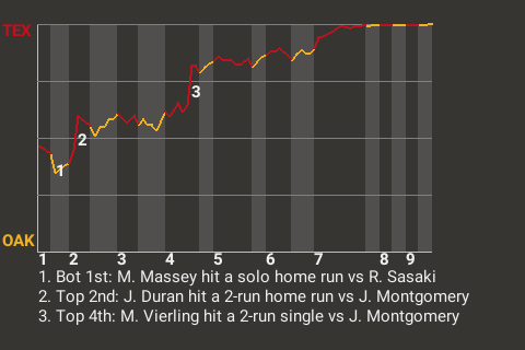 In the top of the fourth, Texas first baseman Matt Vierling had a productive at-bat. With the bases loaded and two out, Vierling stroked a 2-run single to left-center. It made the score 4-1, Texas. For the game, he was 1 for 6. He drove in 2 runs.