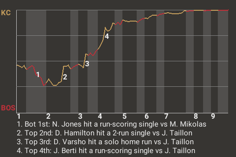 The Kansas City Royals defeated the Boston Red Sox, 9-2, at Fenway Park. Kansas City shortstop David Hamilton had a superb performance. He was 3-4 with a triple and 2 singles, while adding 4 RBI and scoring once. Kansas City is 53-60 and Boston, with the loss, 57-57.