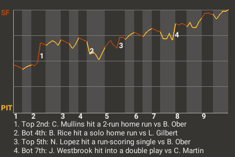 Early in the game, Mullins had a 2-run home run for San Francisco. It was his 7th home run of the season and put the Giants on top, 2-0.