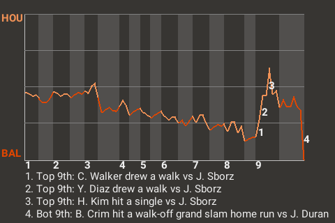 Baltimore got a knockout punch from Blaine Crim. The pinch hitter hammered a grand slam home run in the bottom of the ninth inning to win the game. It might've been his only hit, but it decided the outcome.