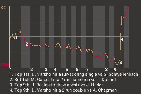 Who knows how it would've ended, had it not been for Daulton Varsho? The slugging left fielder Varsho stroked a 2-run double in the top of the ninth inning to put Kansas City up, 3-2. For the game, he was 2 for 4, including 1 double and 1 single.