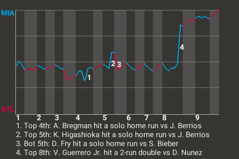 Miami used a timely hit from Vladimir Guerrero Jr. to get the win. The first baseman stroked a 2-run double in the top of the eighth inning to put the Marlins ahead, 4-2. It was his only hit in 4 at-bats, but it made an impact.