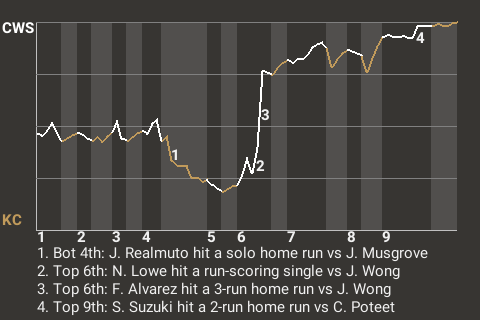 Chicago took a 4-2 lead on Alvarez's 24th home run of the season. The 3-run home run, which he hit off Jake Wong in the top of the sixth, propelled Chicago to the win.