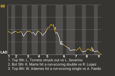 The Dodgers got a big at-bat from second baseman Ketel Marte. For the game, Marte was 1-4 with a double. In the bottom of the fifth, with runners on 1st and 3rd, he stroked a run-scoring double. His 23rd double of the season gave Los Angeles a 1-0 lead.