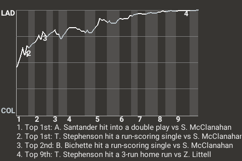 With Los Angeles leading 6-1 in the top of the ninth, Stephenson came up to bat against Colorado pitcher Zack Littell. Stephenson hit a slider to right-center for a 3-run home run. His 11th home run of the season put the Dodgers on top, 9-1.