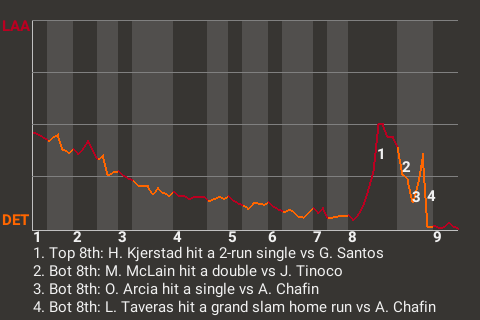 Leody Taveras took Los Angeles hurler Andrew Chafin deep in the bottom of the eighth. His grand slam home run put the Tigers on top, 7-3. In all, Taveras had 1 single in addition to the home run, while going 2 for 5.