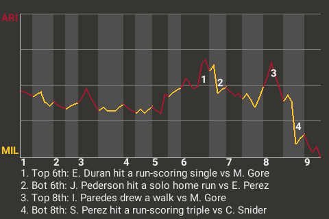 Milwaukee took a 3-2 lead on Salvador Perez's 3rd triple of the season. The run-scoring triple, which Perez hit in the bottom of the eighth, left Arizona pitcher Collin Snider visibly frustrated.