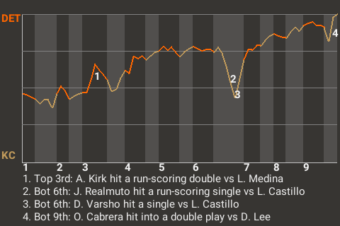 The Detroit Tigers converted a terrific effort from starter Luis Castillo into a win over the Kansas City Royals at Kauffman Stadium. The Tigers won the game by a final score of 3-1. Castillo picked up the win for Detroit, going 6.2 innings. He gave up 1 run on 7 hits. He now sports a record of 12-8. The Tigers lead the American League Central Division by 14½ games.
