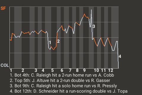 Colorado beat San Francisco at Colorado Field, eking out a 4-3 win in 12 innings. The win was due in large part to catcher Cal Raleigh. He was 2-5 with 2 home runs, while adding 3 RBI and scoring twice. Colorado is now 81-57, San Francisco 73-65.