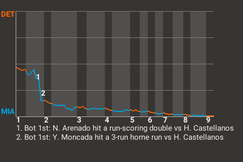 With Miami leading 1-0 in the bottom of the first, Moncada hit a curveball from Humberto Castellanos for a 3-run home run. It was his 12th home run of the season and put the Marlins ahead, 4-0.