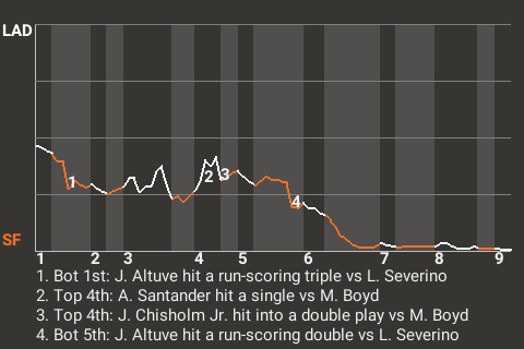 Jose Altuve had a big run-scoring double for the Giants in the bottom of the fifth inning. With San Francisco leading 2-1 and a runner on 3rd, he got a fastball from Luis Severino, who led the AL in innings pitched with 239.0 in 2021, and swatted a double to left. It was his 25th double of the season, and more importantly, it put the Giants ahead, 3-1.