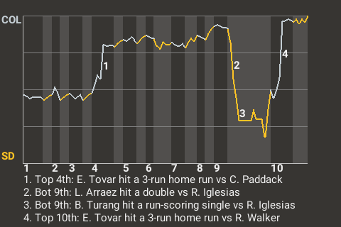 Mahle, a native of Newport Beach, California, was dealing all game. He kept San Diego hitters off-balance, while giving the Rockies 7.2 quality innings. Mahle threw 91 pitches, allowing 1 hit and striking out 13.