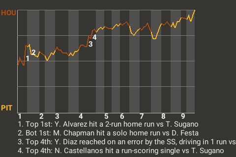Early in the game, Alvarez had a 2-run home run for Houston. It was his 34th home run of the season and put the Astros on top, 2-0.