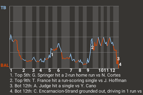 The clutch at-bat came in the bottom of the 12th inning, when Baltimore first baseman Christian Encarnacion-Strand, facing Ethan Small, had a run-scoring ground out. It gave the Orioles the 6-5 win.