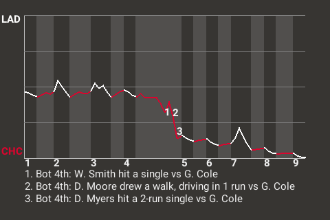 Chicago left fielder Dane Myers contributed a timely at-bat in the bottom of the fourth. With two down, he hit a cutter to center field for a 2-run single. It was his 1st hit of the season and put the Cubs ahead, 3-0.
