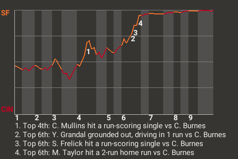 Cedric Mullins went 2 for 3 with 2 singles and a walk for San Francisco. The 30-year old center fielder had a key at-bat in the top of the fourth. With one out and runners on 1st and 3rd, he broke a 0-0 tie with a run-scoring single off Corbin Burnes. It was his 2nd hit of the season.