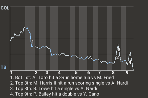 The Rays got a big at-bat from third baseman Abraham Toro. For the game, Toro was 1 for 4 with a home run. He drove in 3 runs and scored once. In the bottom of the first, with runners on 1st and 3rd, he stroked a 3-run home run. His 1st home run of the season gave Tampa Bay a 3-2 lead.