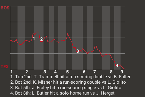 The Texas Rangers beat the Boston Red Sox, 3-1, at Globe Life Field. Starting pitcher Bailey Falter was a big reason why. He held his opponent in check all game. Falter picked up the win for Texas, going 5.2 innings. He gave up 1 run on 4 hits. He now sports a record of 1-0. Boston is 1-2 after the loss.