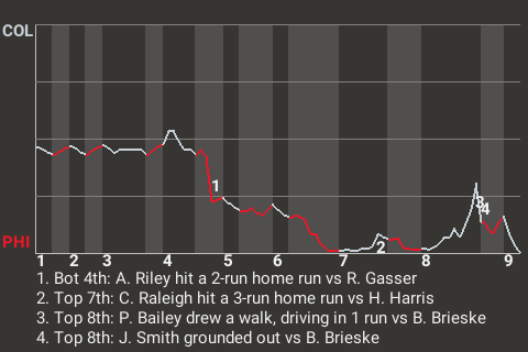 The game turned with one out in the bottom of the fourth. That's when Riley hit a 2-run home run off Robert Gasser. It propelled the Phillies into the lead, 2-0.