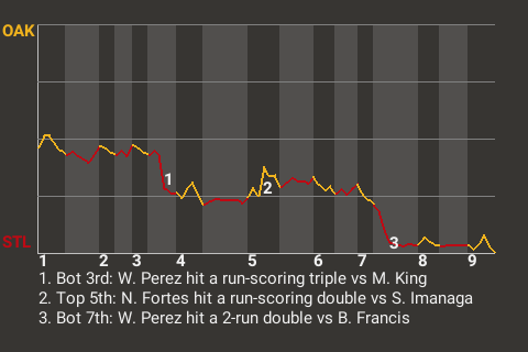 The Cardinals got a big at-bat from right fielder Wenceel Perez. For the game, Perez was 2-3 with a triple, a double, and a walk, while scoring 2 and driving in 3. In the bottom of the third, with a runner on 1st, he stroked a run-scoring triple. His 1st triple of the season gave St. Louis a 1-0 lead.