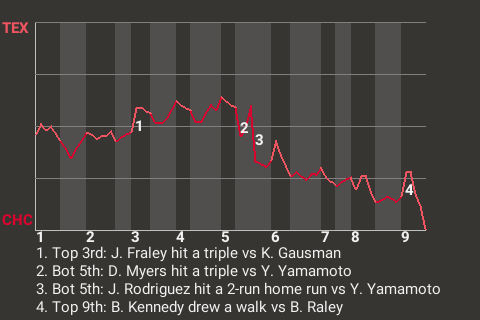 The Cubs got a big at-bat from center fielder Julio Rodriguez. For the game, Rodriguez was 1-4 with a home run. He drove in 2 runs and scored once. In the bottom of the fifth, with a runner on 3rd, he stroked a 2-run home run. His 5th home run of the season gave Chicago a 2-1 lead.