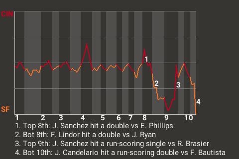 The decisive blow was delivered by Jeimer Candelario in the bottom of the tenth when he hit a run-scoring double off 29-year old right-handed pitcher Felix Bautista to win the game for San Francisco. The home crowd went nuts.