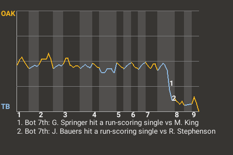 Had George Springer not delivered a key base hit in the bottom of the seventh, the outcome might have been different. Instead, with two down and runners on 1st and 3rd, Springer hit a run-scoring single. That made the score 1-0, in favor of the Rays.
