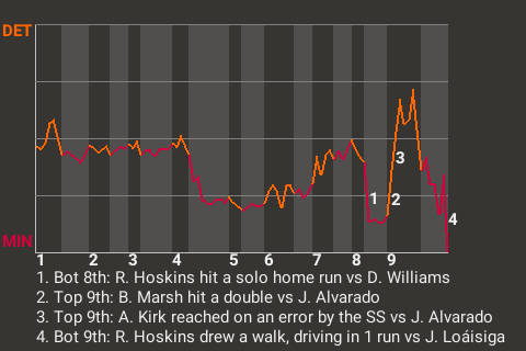 The clutch at-bat came in the bottom of the ninth inning, when Minnesota designated hitter Rhys Hoskins, facing Jonathan Loáisiga, had a run-scoring walk. It gave the Twins the 4-3 win.