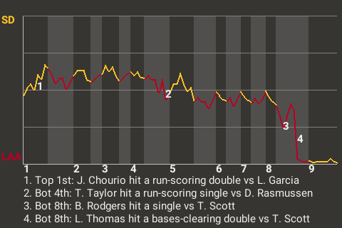 Los Angeles took a 5-2 lead on Lane Thomas's 4th double of the season. The bases-clearing double, which Thomas hit in the bottom of the eighth, left San Diego pitcher Tanner Scott visibly frustrated.