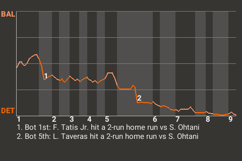 Leody Taveras had a big 2-run home run for the Tigers in the bottom of the fifth inning. With Detroit leading 2-1 and a runner on 2nd, he sized up a curveball from Shohei Ohtani, who finished 5th in the AL in strikeouts with 215 last year, and punished it. The result was his 4th home run of the season, which put the Tigers on top, 4-1.