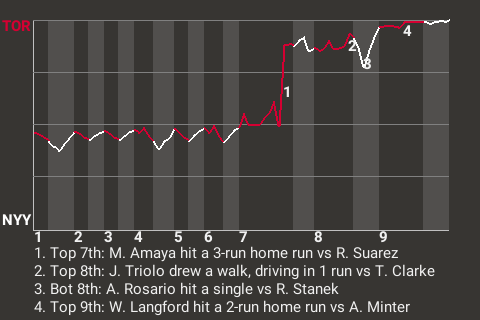 Miguel Amaya came through with a big-time hit for Toronto. The catcher smacked a 3-run home run in the top of the seventh inning to give his team the lead, 3-0. It was his only hit, but it was clutch.